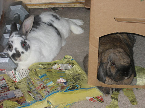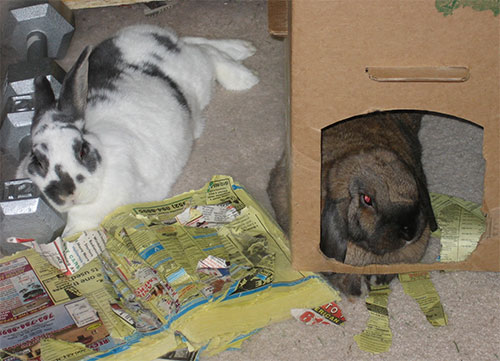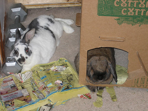 The Cottage Thief routine will last quite a few days, and then they'll switch to something else. Currently, they have a less structured sleepy time routine, where they both stick close to the cottage. Sometimes they'll both be behind it, sometimes both in it, or one behind and one in the cottage. There is no discernible pattern. When one or both of the bunnies lay behind the cottage, however, they often use the weights as a pillow. (The weights are there to keep them from digging the carpet along the wall.)