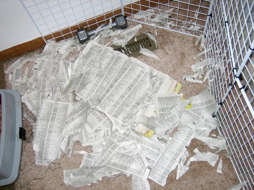 First off, a short story about something that took place last week. There's a phone book in the bunny room because they enjoy tearing pages out and eating them once in a while. Well, it seems that the phone book did something to piss off the rabbits, because this is what I found when I came home from work: